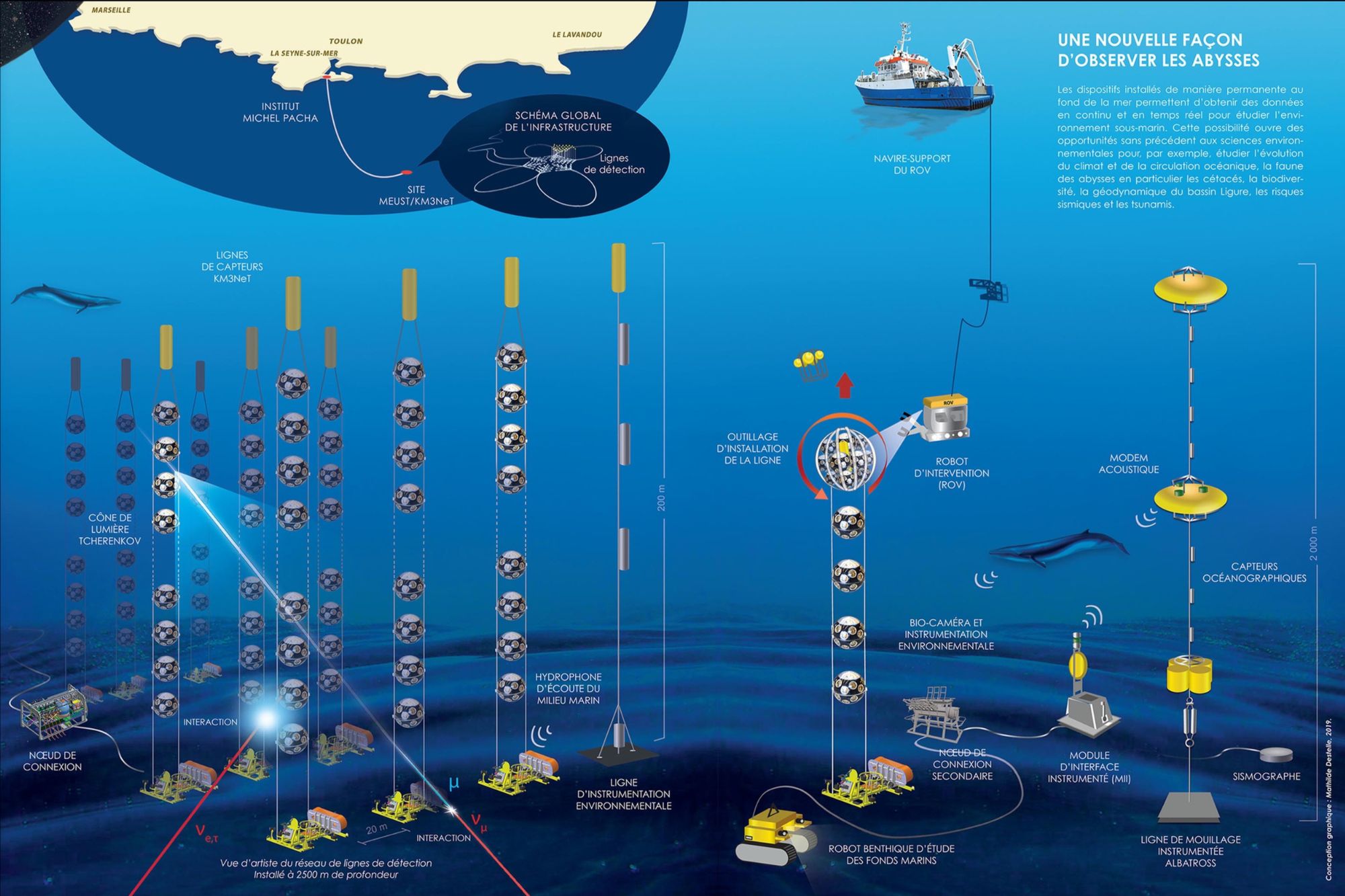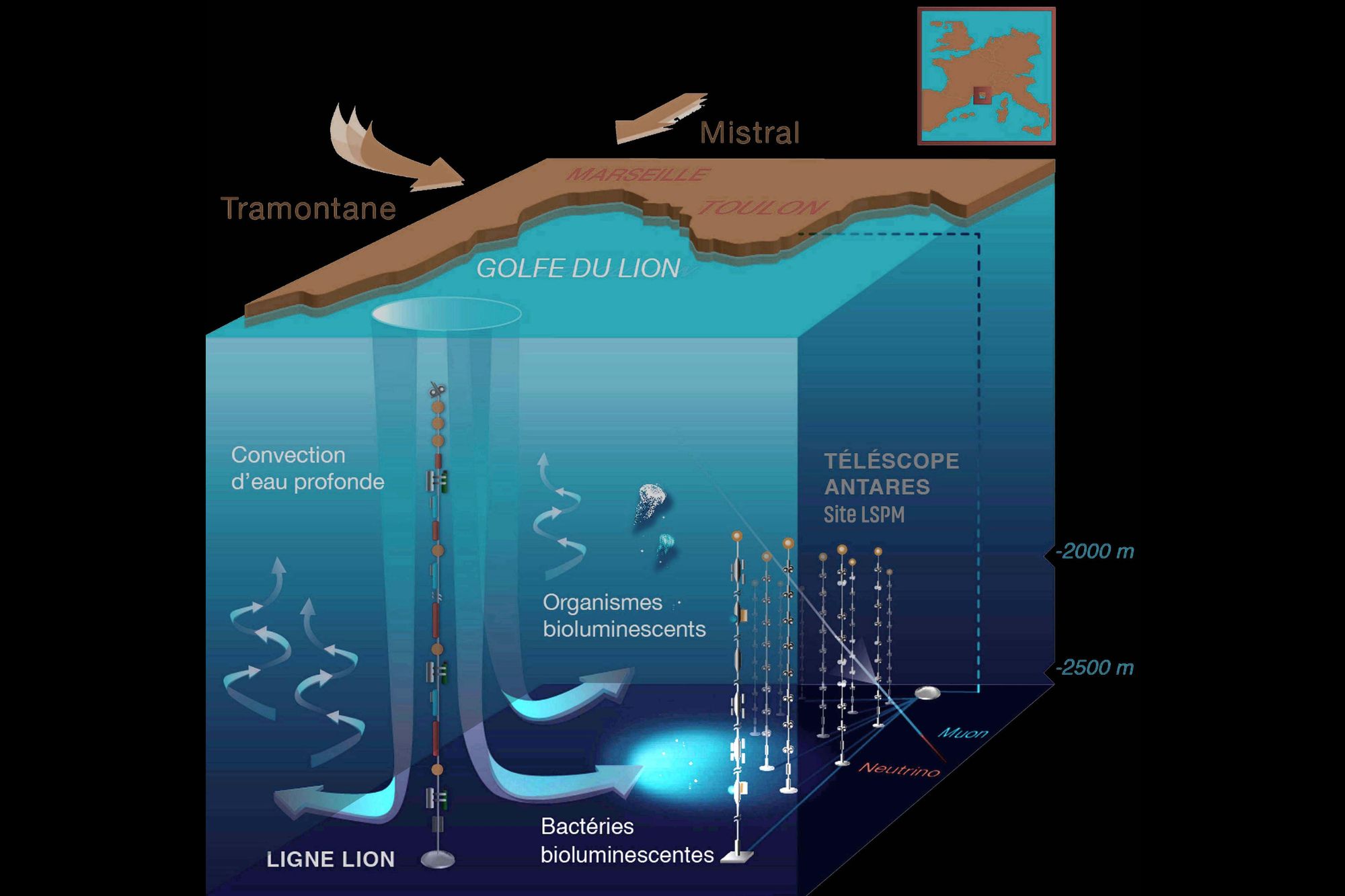 Nous avons découvert que des bactéries bioluminescentes interfèrent avec les données enregistrées par ANTARÈS, un télescope sous-marin situé à 2400 mètres de profondeur au large de La Seyne-sur-Mer. Cet instrument scientifique est chargé de détecter les neutrinos, particules cosmiques de haute énergie.