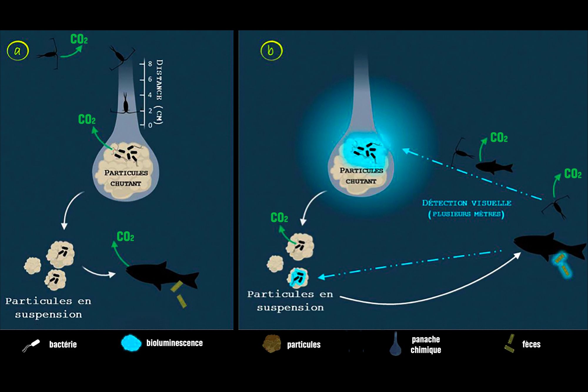 Auparavant, les scientifiques pensaient que les petites particules qui tombent vers les fonds marins étaient mangées par le zooplancton uniquement lors de rencontres dues au hasard (voir la figure centrale, partie a). Une fascinante découverte bouleverse cette vision : des bactéries lumineuses s’accrochent à ces particules !
